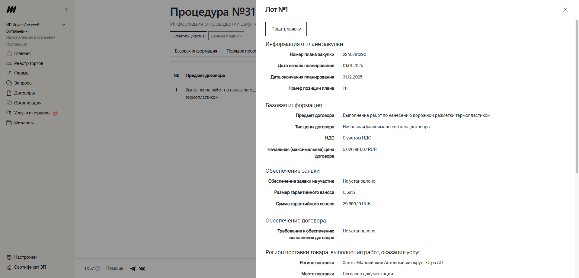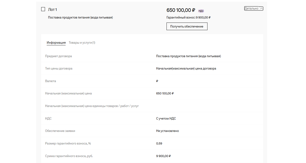 Также посмотреть стоимость участия к конкретной закупке, обеспечение заявки и обеспечение исполнения договора вы можете в лоте к закупке в личном кабинете поставщика.