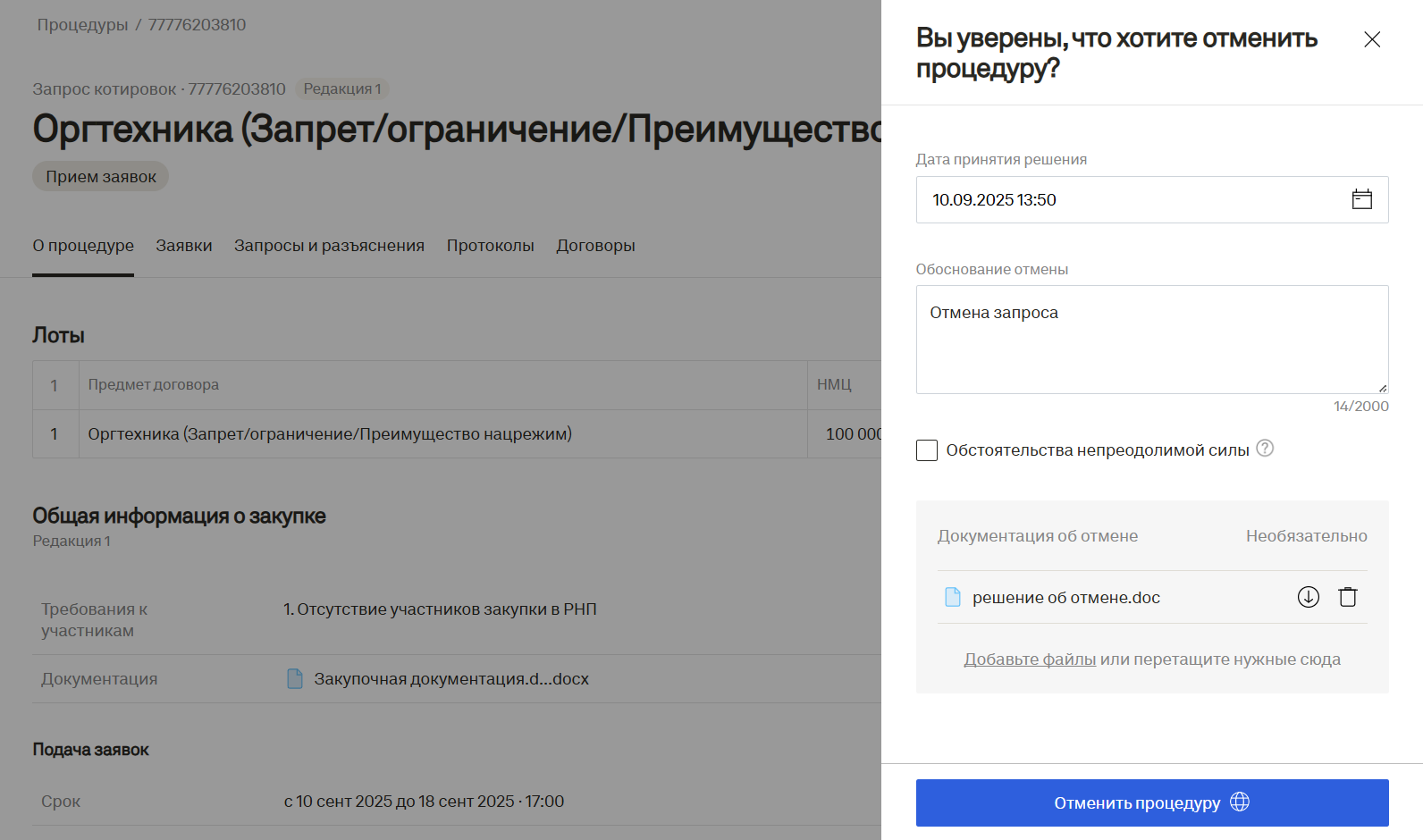 Отменить закупку заказчик может на любом этапе. Для отмены необходимо перейти на страницу извещения о закупке и нажать на кнопку «Отменить процедуру». В открывшемся окне отмены закупки заполните обязательные поля и нажмите кнопку «Отменить».