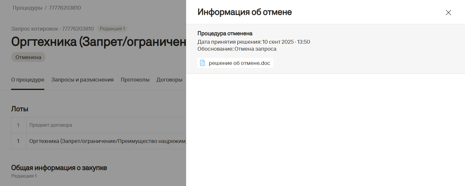 Посмотреть сведения об опубликованной отмене закупки можно на странице извещения, для этого нажмите кнопку «Инфо об отмене».