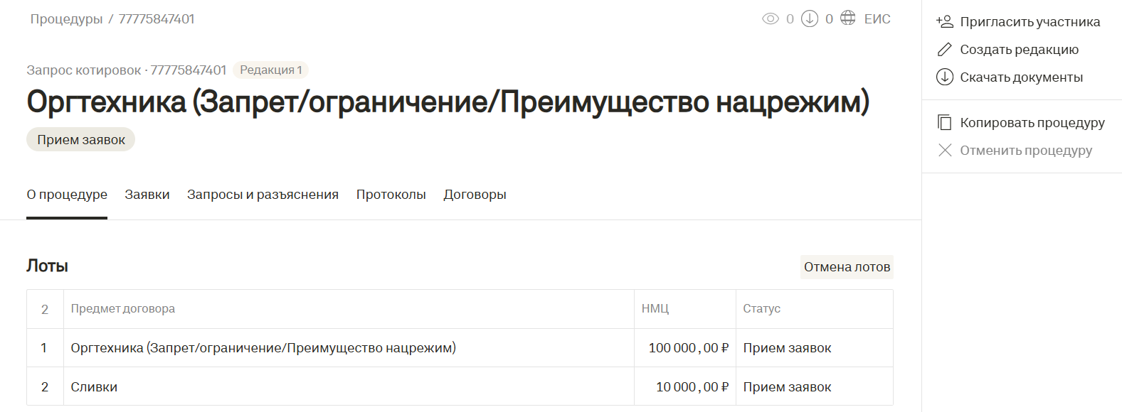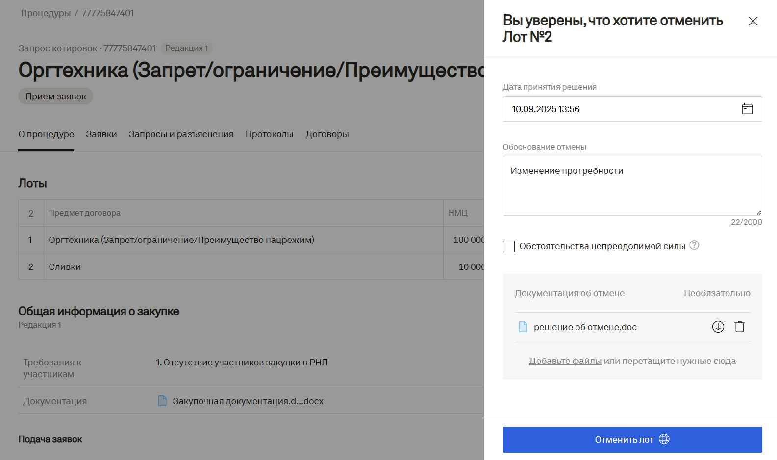 Заполните все обязательные поля на форме и нажмите кнопку «Отменить». Информацию об отмене лота можно посмотреть, выбрав в действиях по отмененному лоту «Информация об отмене лота».