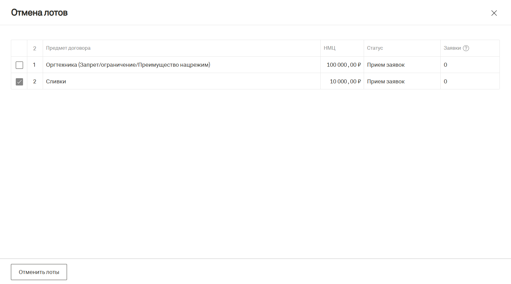Выберите лоты, которые необходимо отменить и нажмите на кнопку “Отменить лоты”