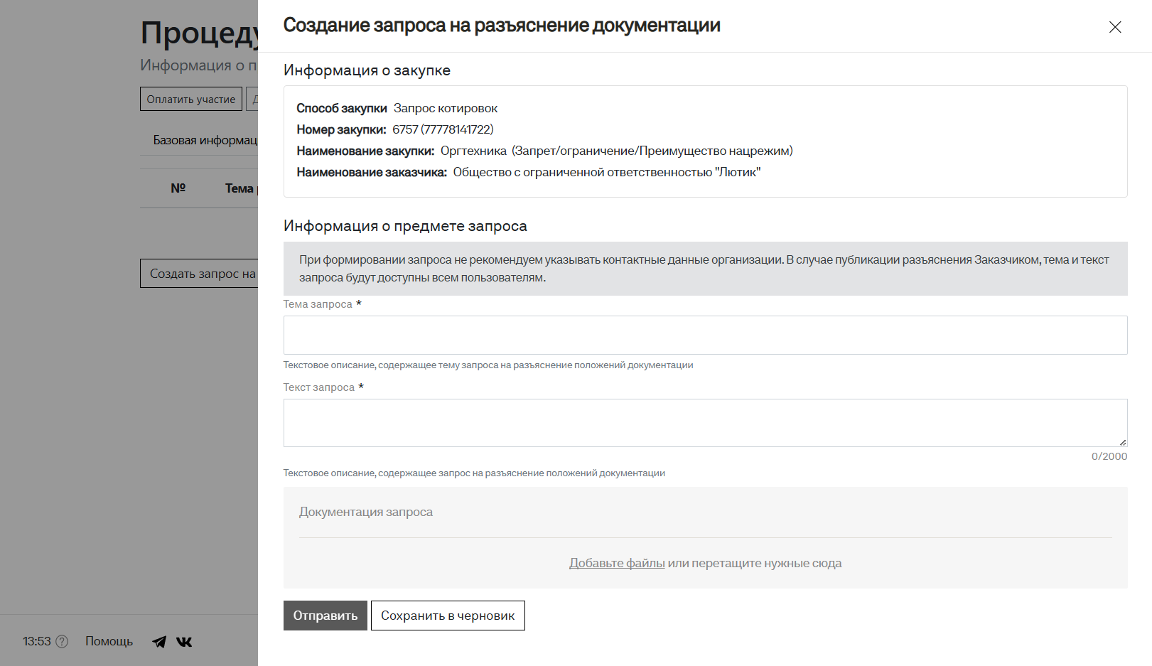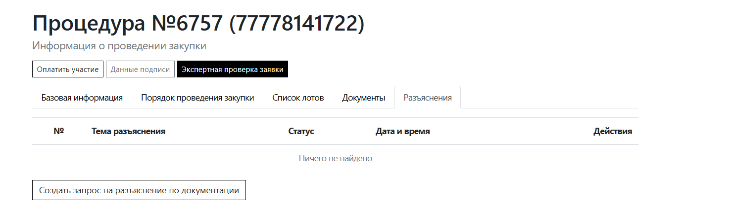 Подача запроса на разъяснение документации по закупке