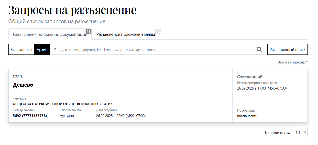 Для просмотра запроса нажмите действие «Посмотреть». Для переноса в архив – «Переместить в архив».