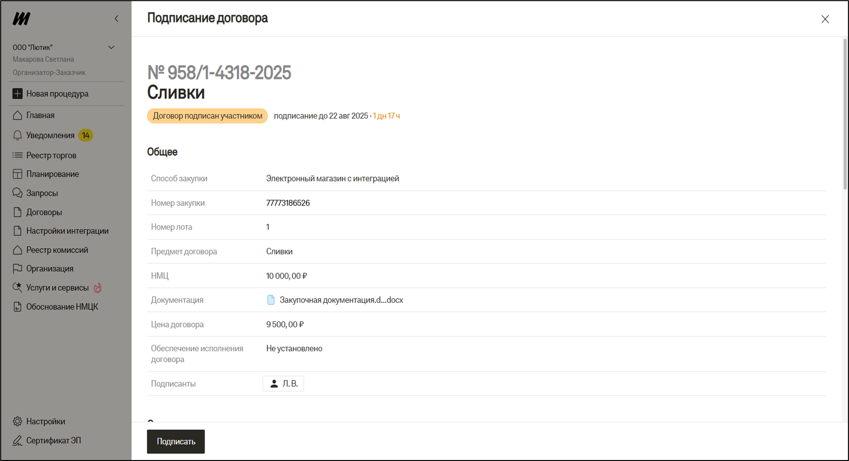 После подписания договора участником, у заказчика появляется возможность произвести его подписание со своей стороны при помощи Электронной подписи. Для этого необходимо на странице договора или через быстрые действия в разделе “Договор” нажать кнопку «Перейти к подписанию».