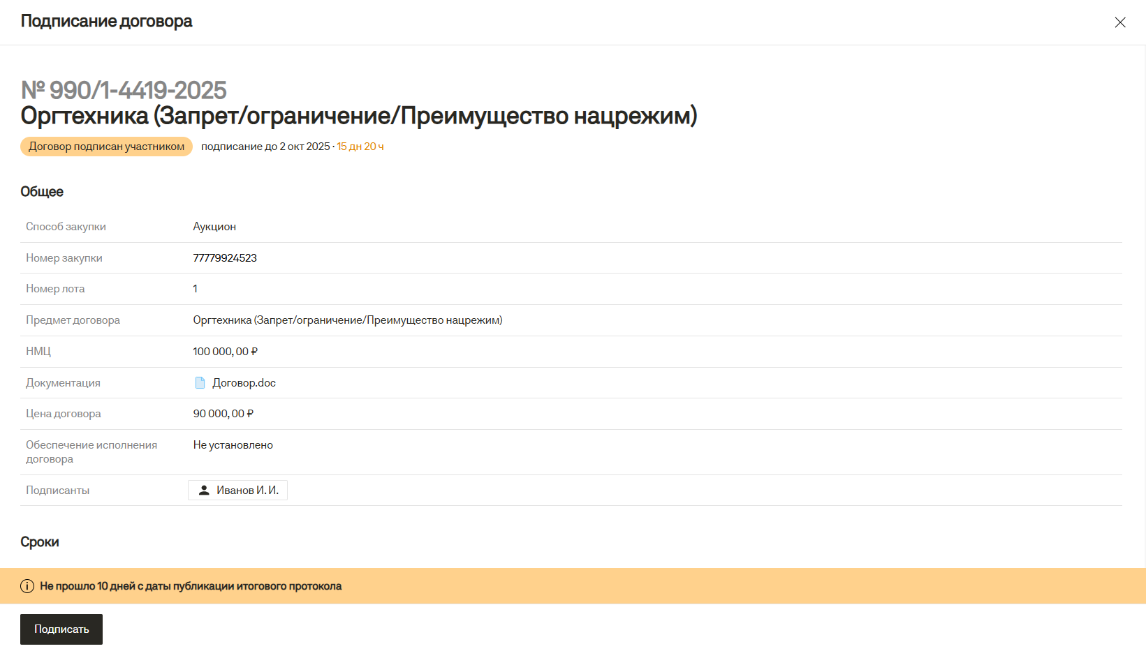 На конкурентной закупке на ЭТП Торги 223 предусмотрен автоматический счетчик на подписание договора заказчиком, который информирует вас о том, что не прошел срок для подписания договора. Договор на конкурентной закупке подписывается в срок не ранее 10 календарных дней и не позднее 20 календарных дней. Это сделано чтобы избежать ошибок при подписании договора раньше положенного срока.