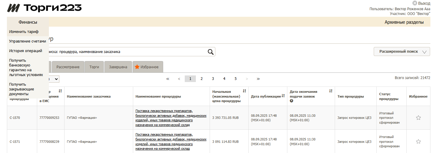 Смену тарифного плана аккредитованный поставщик может осуществить в Личном кабинете на основной версии площадки. Переход осуществляется через Личный кабинет участника, нажав на вкладку “Финансы”