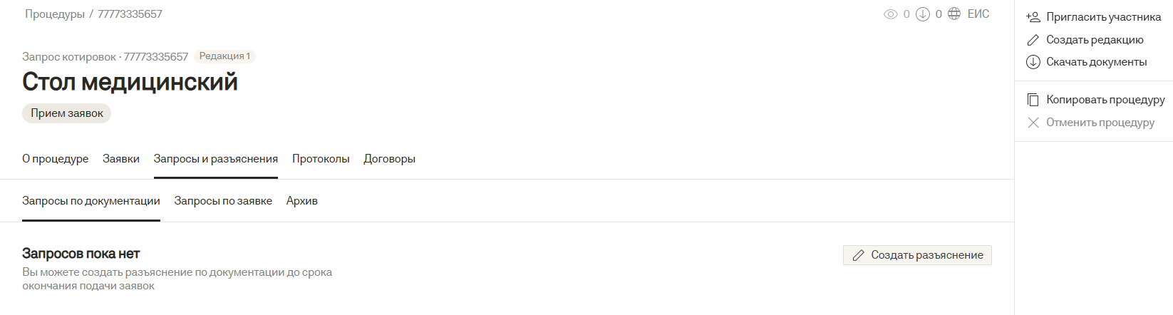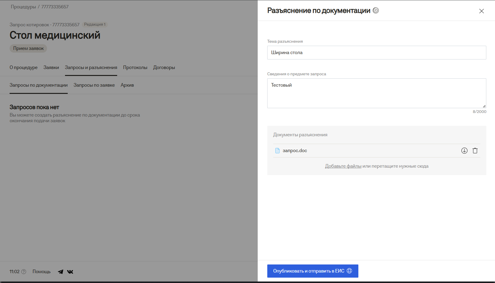 Поступивший запрос на разъяснение положений документации отображается в реестре запросов на разъяснение положений документации.