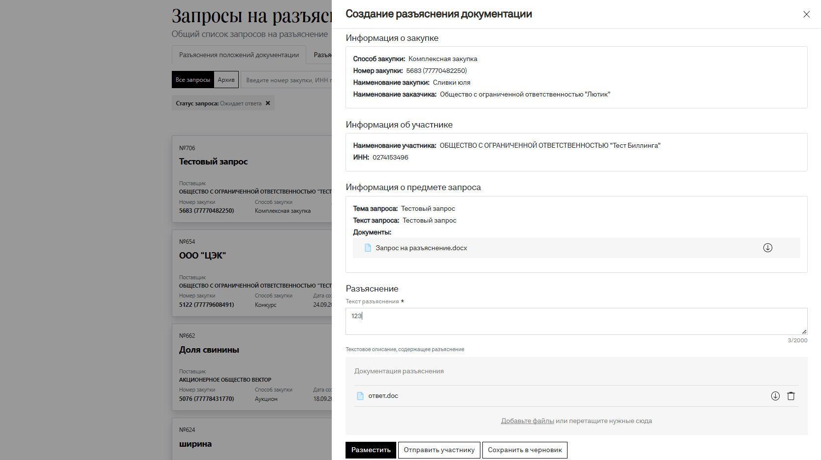 - Разместить – сведения о разъяснениях будут доступны всем пользователям ЭТП.