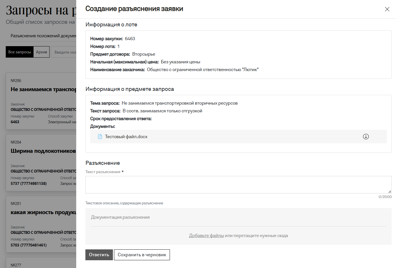 Для ответа на запрос выберите пункт «Ответить». На открывшейся странице создания разъяснения заполните все обязательные поля (со знаком «*»):