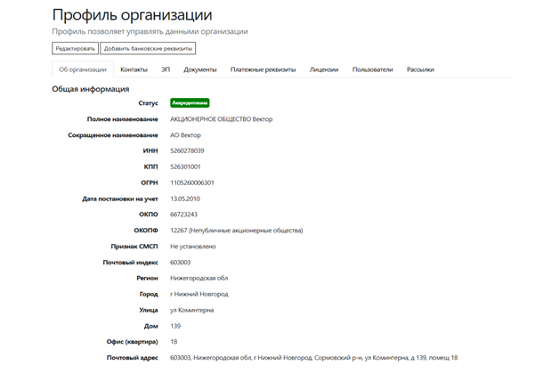 - Редактирование данных организации