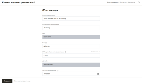 Внести изменения вы сможете в следующие поля: Сведения об организации, кроме поля “ИНН” и поля “ОГРН”; Контакты; Документы. Вносим необходимые изменения, например в наименование организации/КПП и нажимаем на кнопку “Сохранить”. Если вы заполнили все нужные поля, на ЭТП подсветится надпись “Нужные поля заполнены” возле кнопки “Сохранить”.
