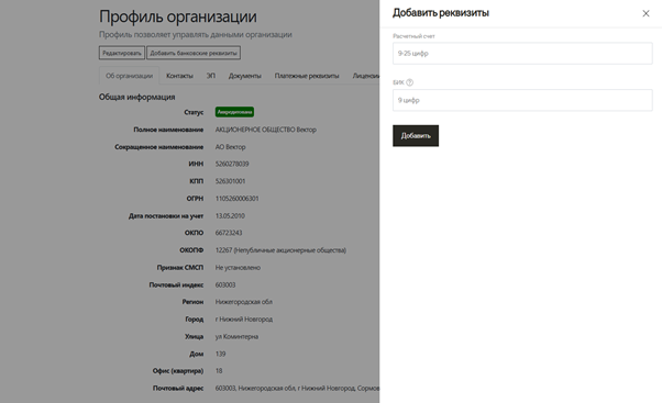 В этом разделе вы сможете добавить банковские реквизиты организации на ЭТП Торги 223. Нажмите на кнопку “Добавить банковские реквизиты” в разделе “Организация”, заполните “Расчетный счет” “БИК банка”, и нажмите на кнопку “Добавить”.