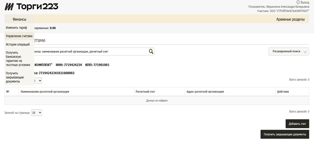 Для создания реквизитов на ЭТП Торги 223, нажмите на раздел “Финансы” в левой части сайта. Перейдите в раздел “Управление счетами” и нажмите на кнопку “Добавить счёт”.