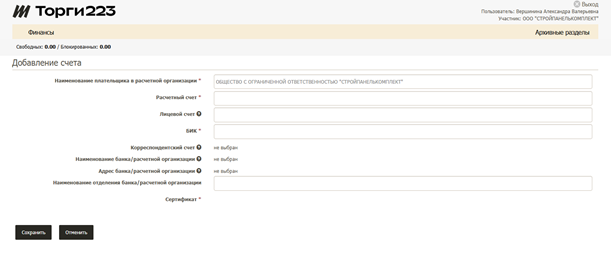 В открывшейся странице, для создания реквизитов, введите номер расчетного счета, БИК банка и нажмите на кнопку “Сохранить”.