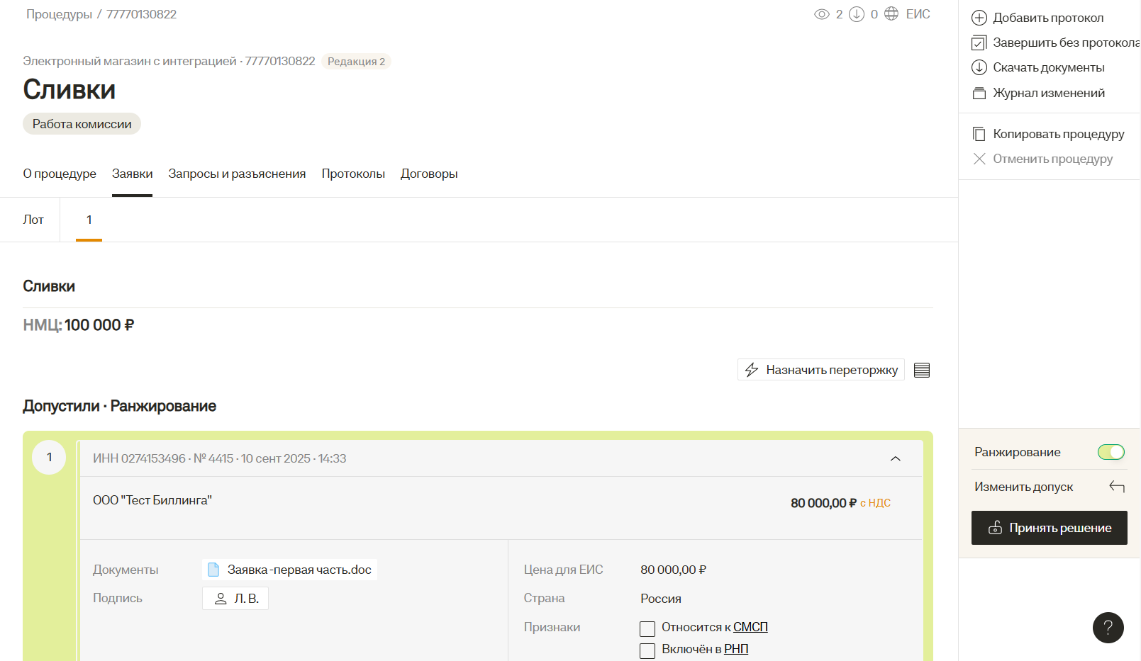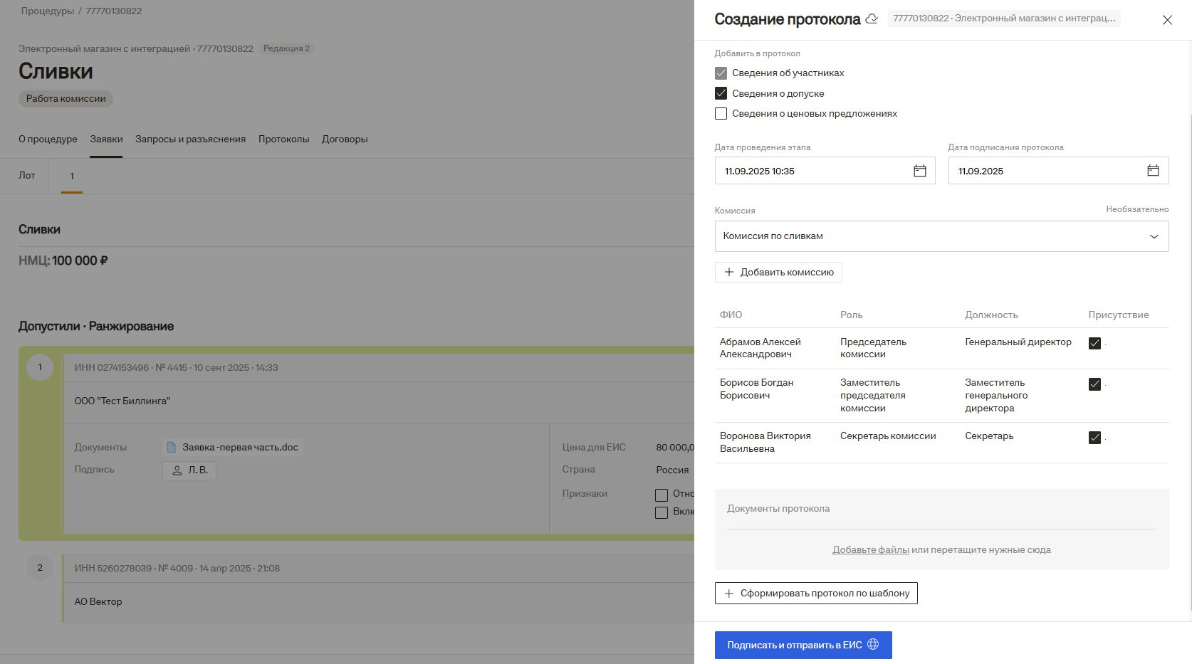 Автоматическое формирование протоколов. Система позволяет автоматически формировать протоколы закупки, что экономит время на рутинных задачах, протоколы соответствуют всем нормам закона.
