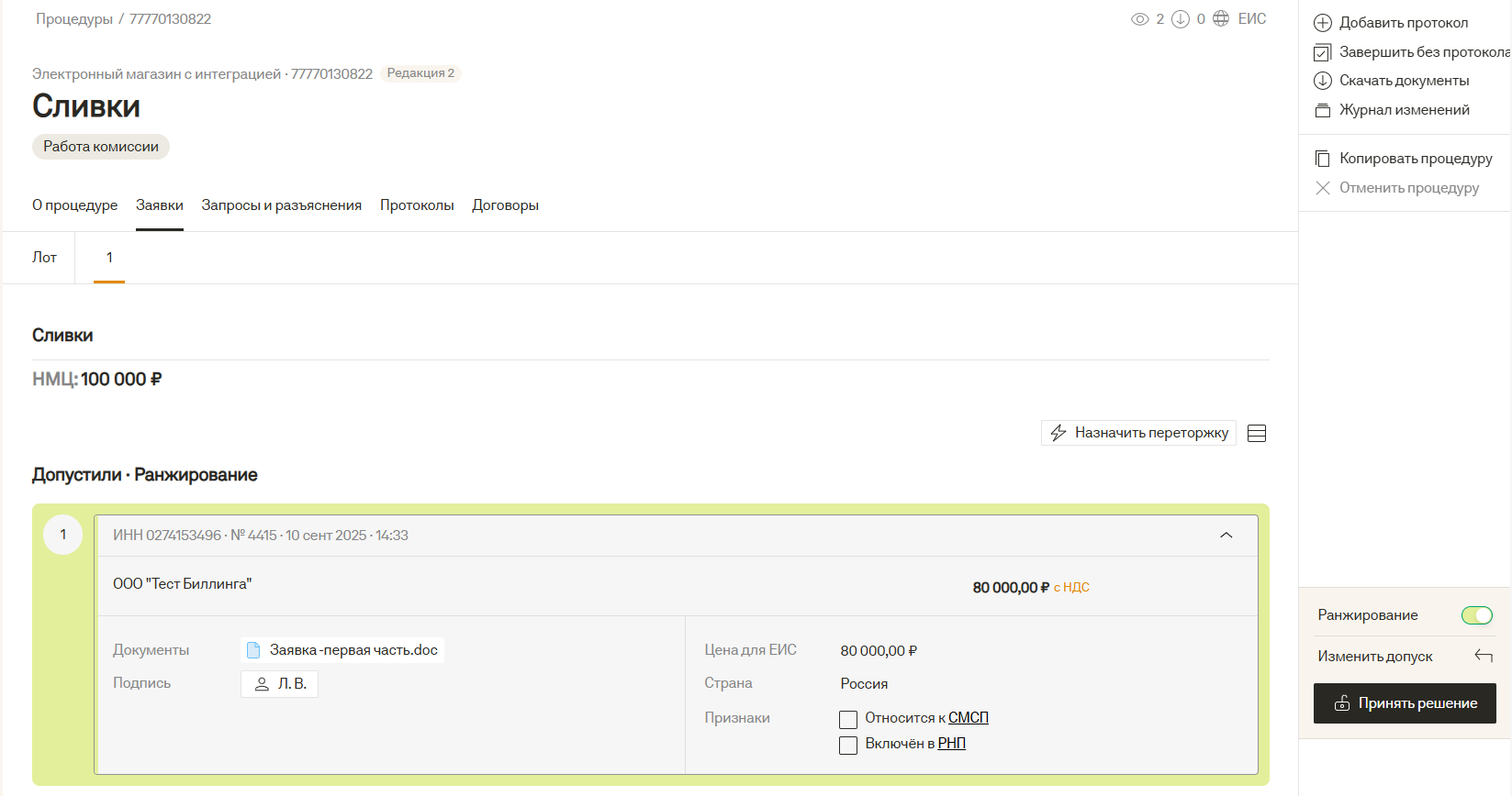 После открытия доступа к поданным заявкам заказчику доступно действие «Направить запрос на разъяснение положений заявки».