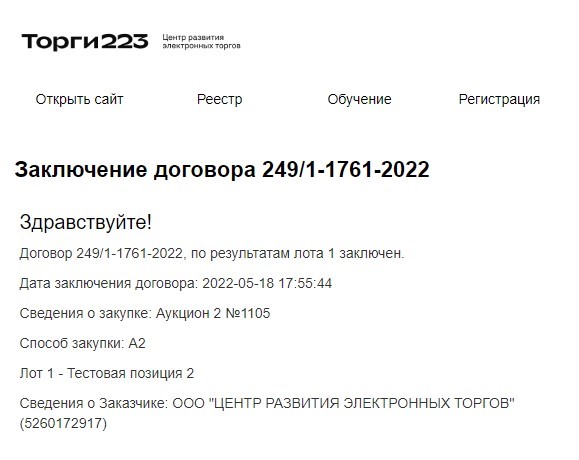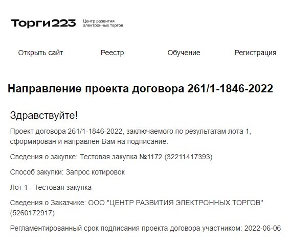 Заключение договора по результатам закупки может происходить как на электронной площадке, так и на бумажном носителе. Рассматривать будем заключение договора первым способом. Если заказчик направил Вам на подписание договор посредством ЭТП, на контактный E-mail поступит соответствующее уведомление: