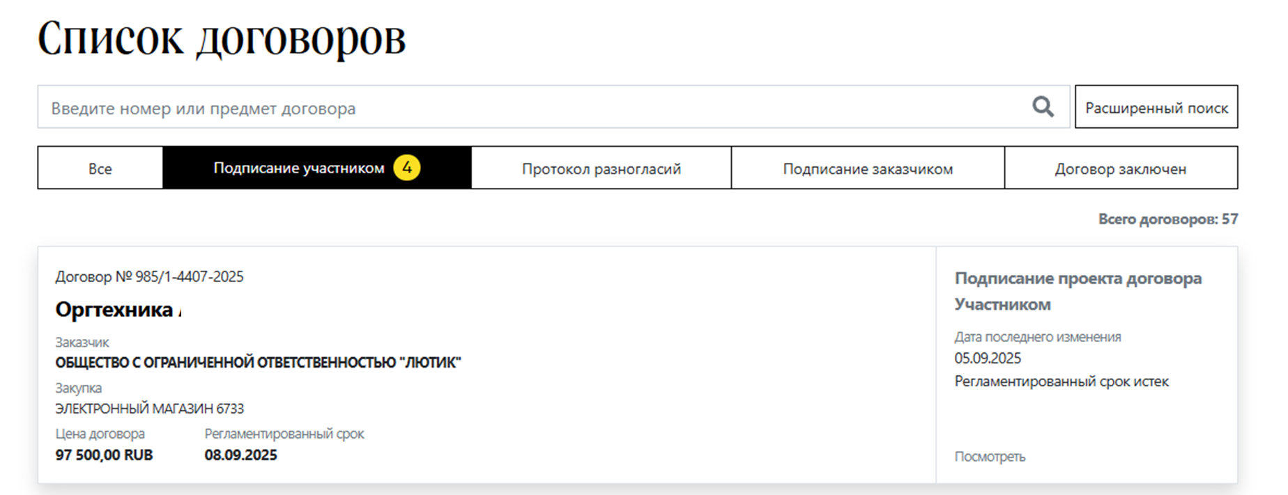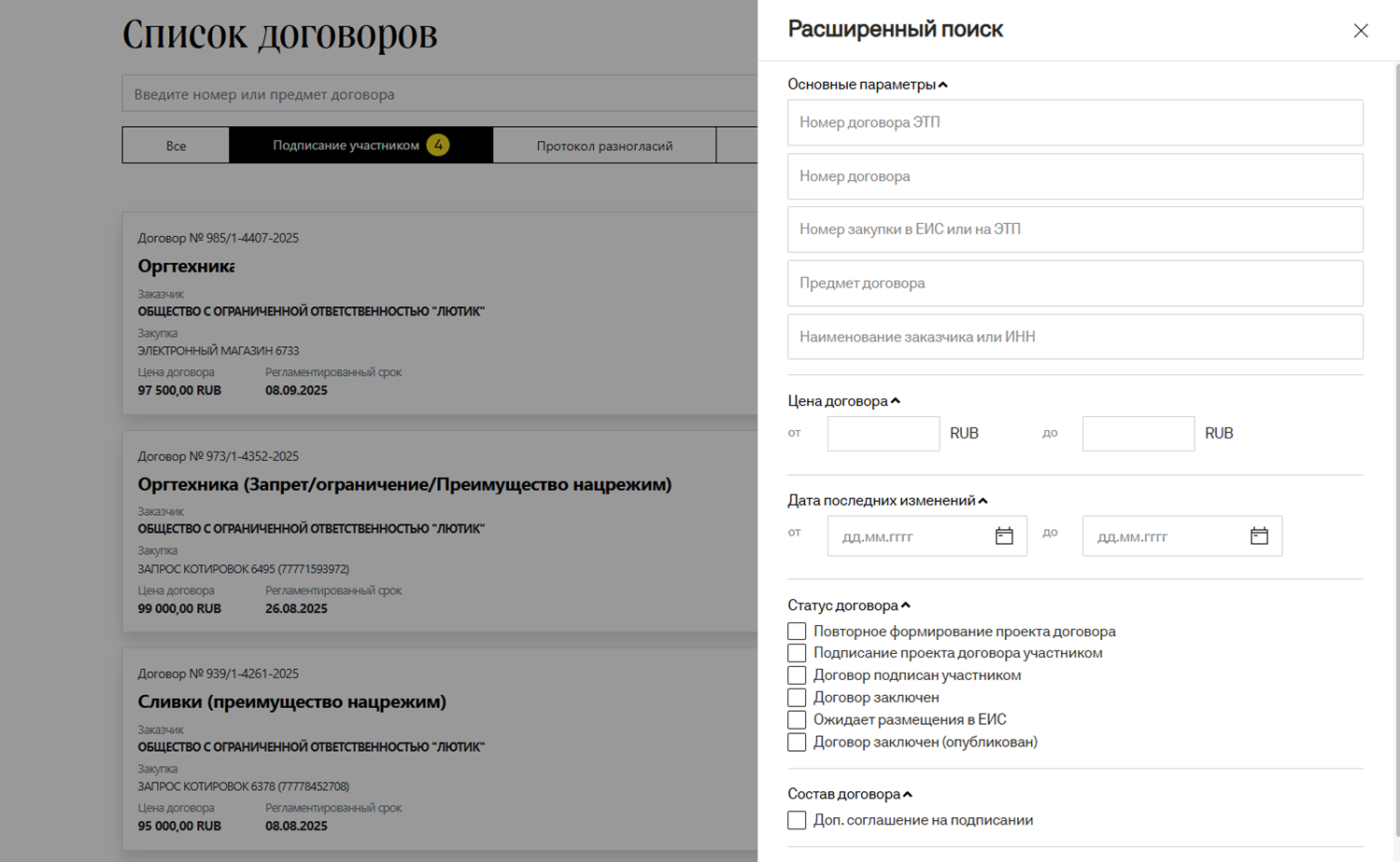 Также возможно воспользоваться функционалом расширенного поиска и найти договор по определенным параметрам: Номер договора ЭТП; Номер договора; Номер закупки в ЕИС или на ЭТП; Предмет договора; Наименование заказчика или ИНН; Цена договора; Статус договора; Состав договора.