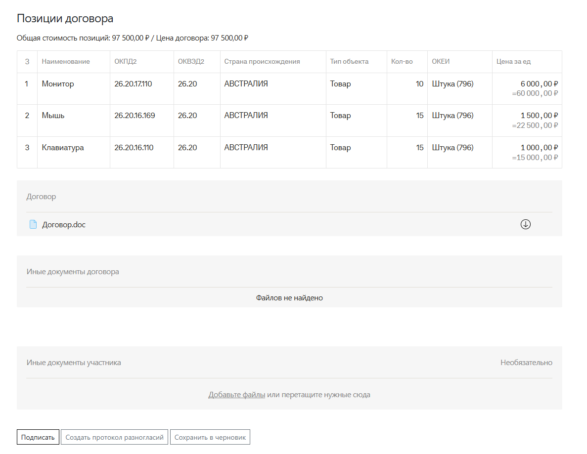 При необходимости участнику доступно прикрепление «Подтверждения обеспечения исполнения договора», «Доверенность» и «Иные документы участника». Для сохранения работы по договору, можно воспользоваться кнопкой «Сохранить черновик», в дальнейшем этот черновик можно отредактировать и подписать. Также доступно действие «Создать протокол разногласий».