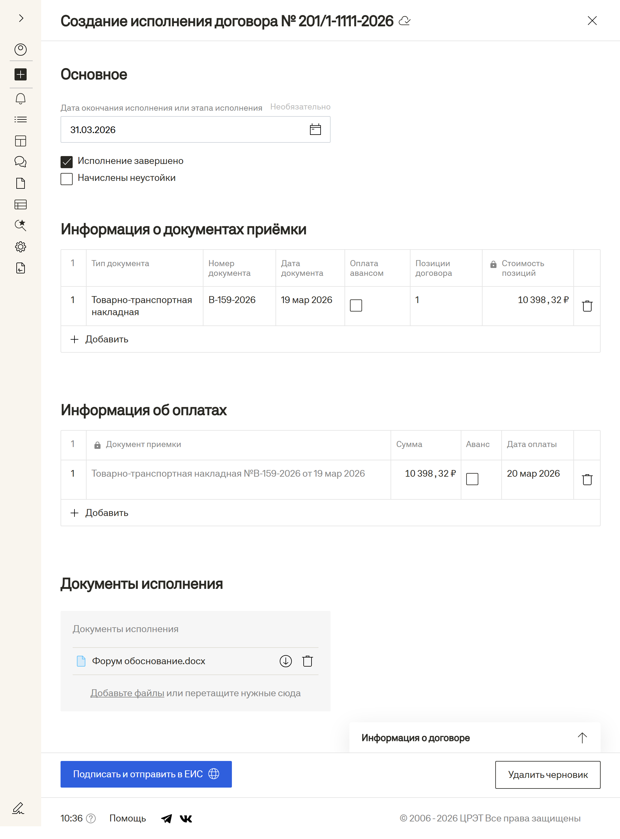 - Возможность работать в удобном темпе без риска потери данных: система автоматически сохраняет черновик, отправка в ЕИС произойдет только после нажатия кнопки «Подписать и отправить в ЕИС».