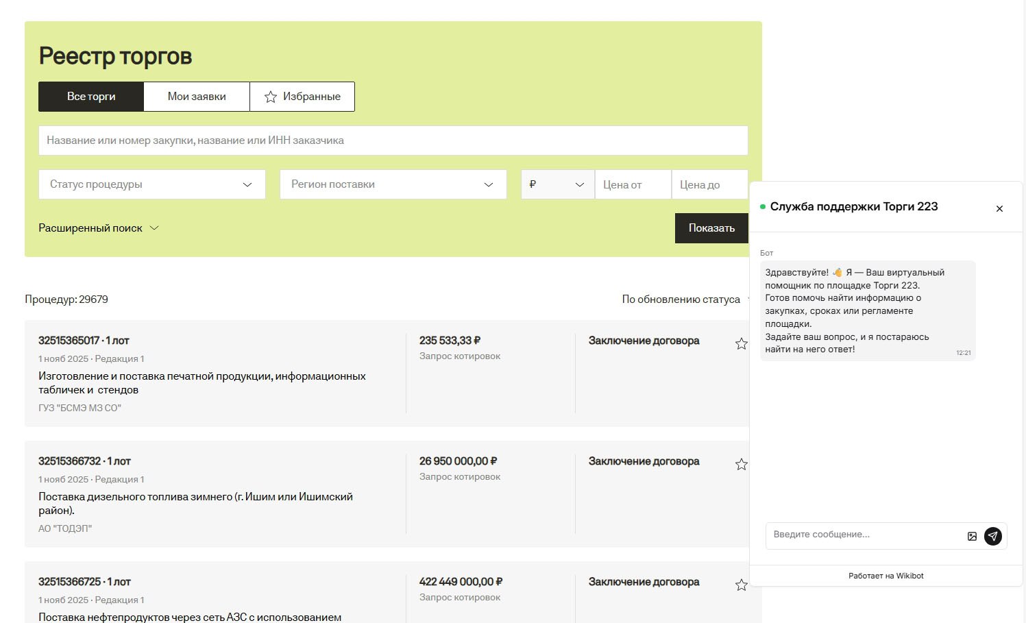 Забудьте о долгом поиске информации! С нашим ИИ-помощником процесс участия в торгах станет значительно быстрее и комфортнее. Попробуйте его в действии прямо сейчас и убедитесь, как легко и удобно работать с “Торги223”! ИИ-чат-бот доступен 24/7.