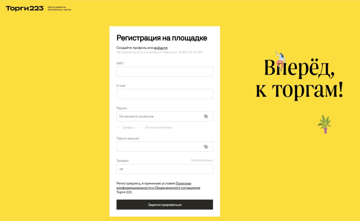 На главной странице торговой площадки в меню нажмите кнопку «Регистрация», после чего откроется страница регистрации учетной записи: