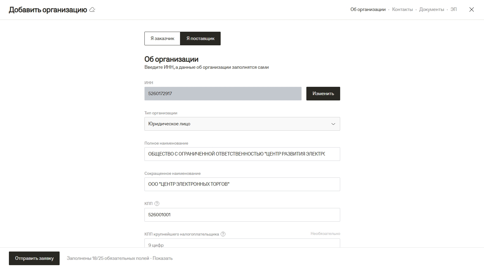Откроется страница «Добавление организации», на которой необходимо заполнить данные об организации. Выберите роль организации — «Поставщик».