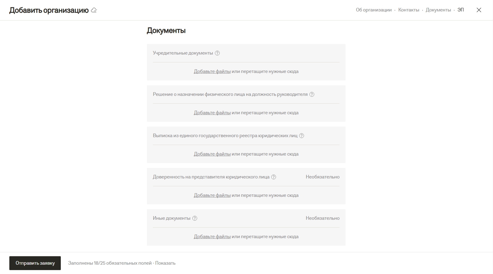 В разделе «Документы» прикрепите все обязательные для регистрации на электронной торговой площадке (ЭТП) документы:
