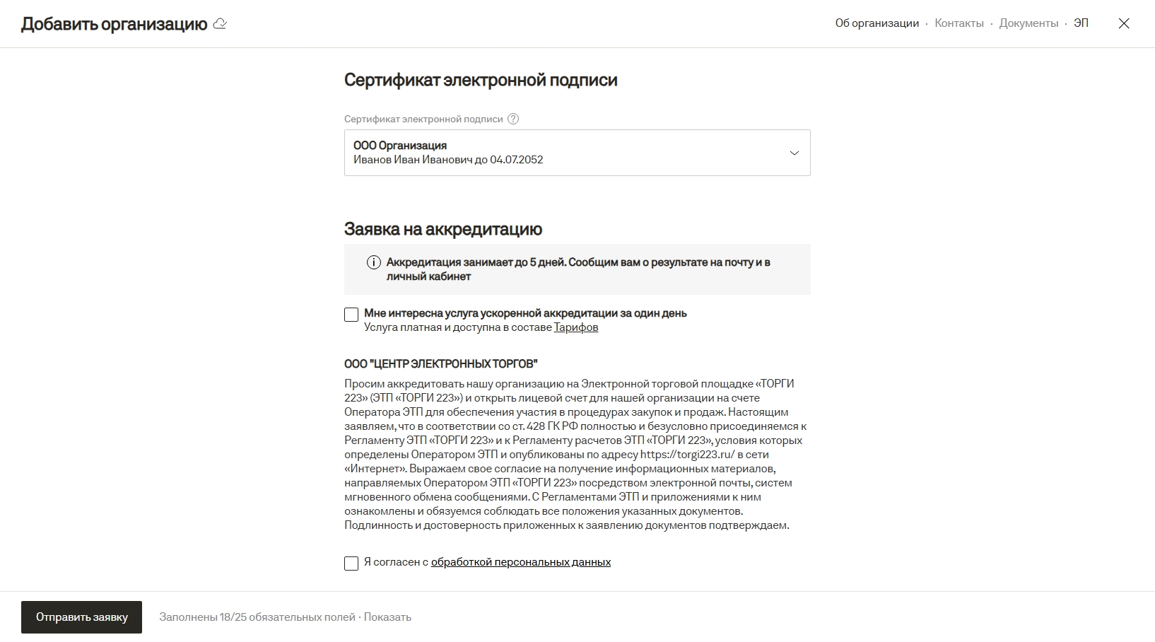 Для того, чтобы начать процедуру аккредитации на площадке необходимо зарегистрировать пользователя организации.