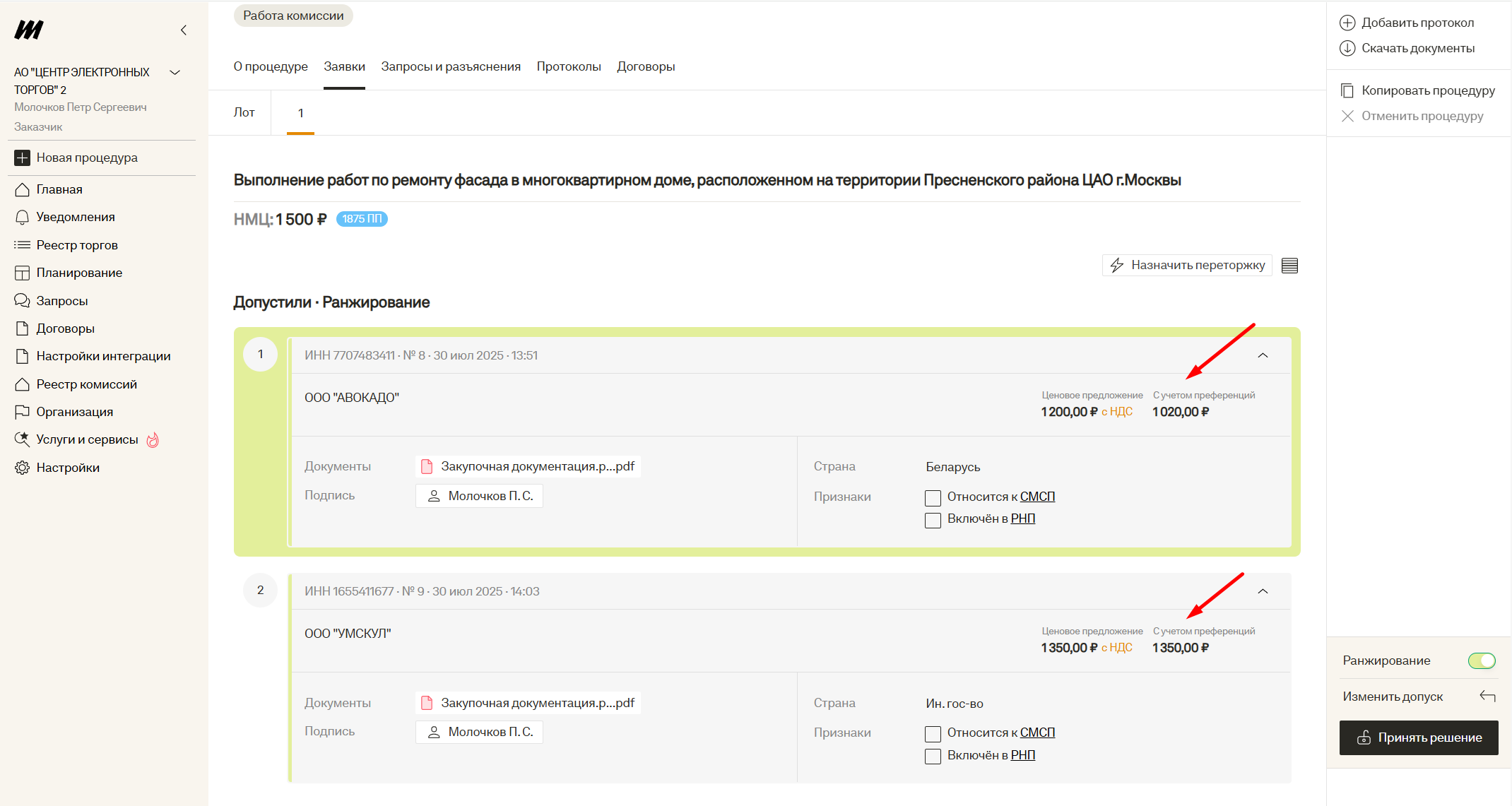 Если в закупке применен параметр «Устанавливается преимущество в отношении товаров российского происхождения…», а лот находится в статусе «Подведение итогов» и имеет более 1 допущенной заявки, система автоматически применяет правило национального режима: