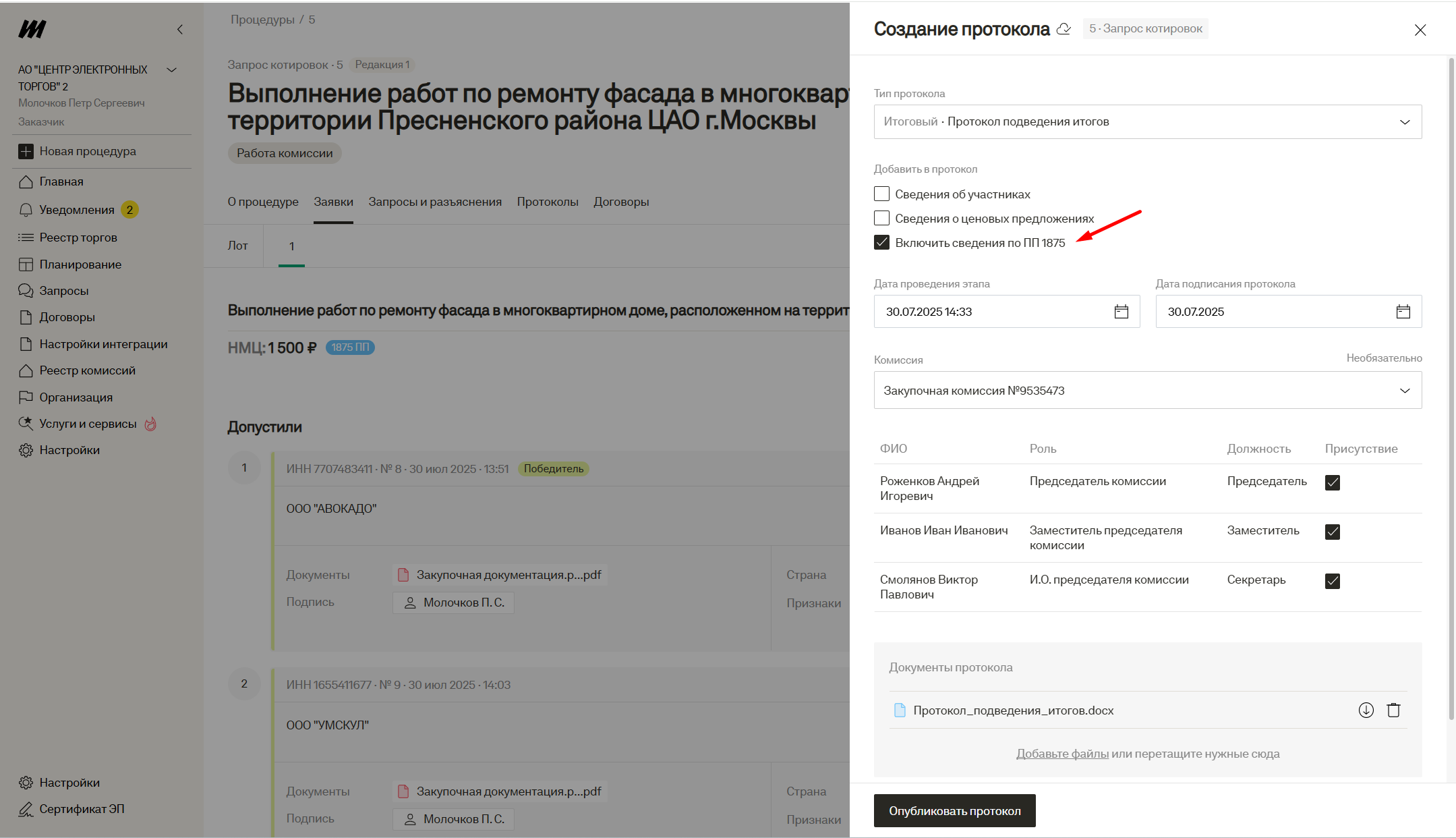 В форме создания итогового протокола доступен новый чек-бокс “Сведения по ПП 1875”, позволяющий включать в протокол информацию о применении нацрежима: