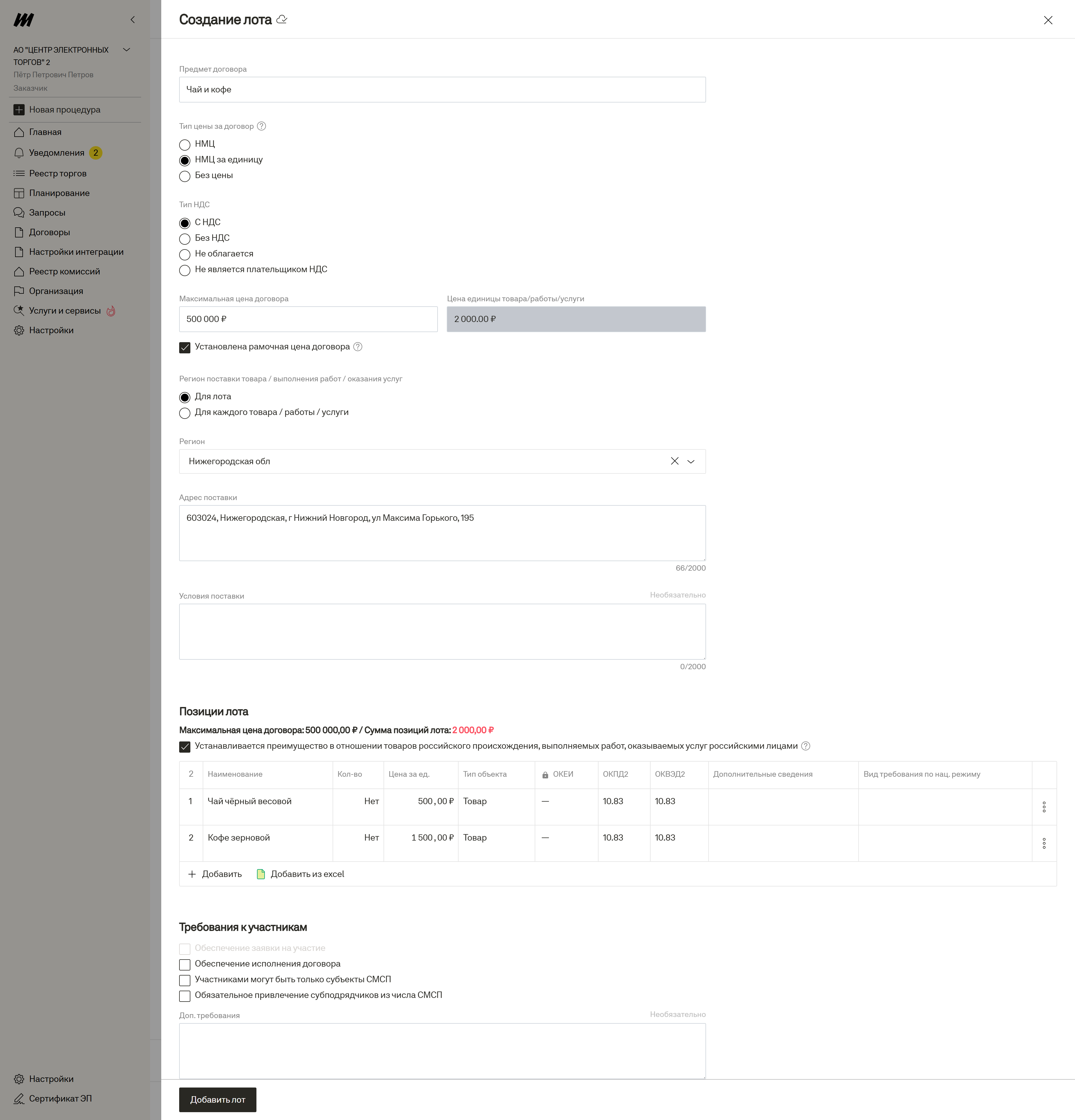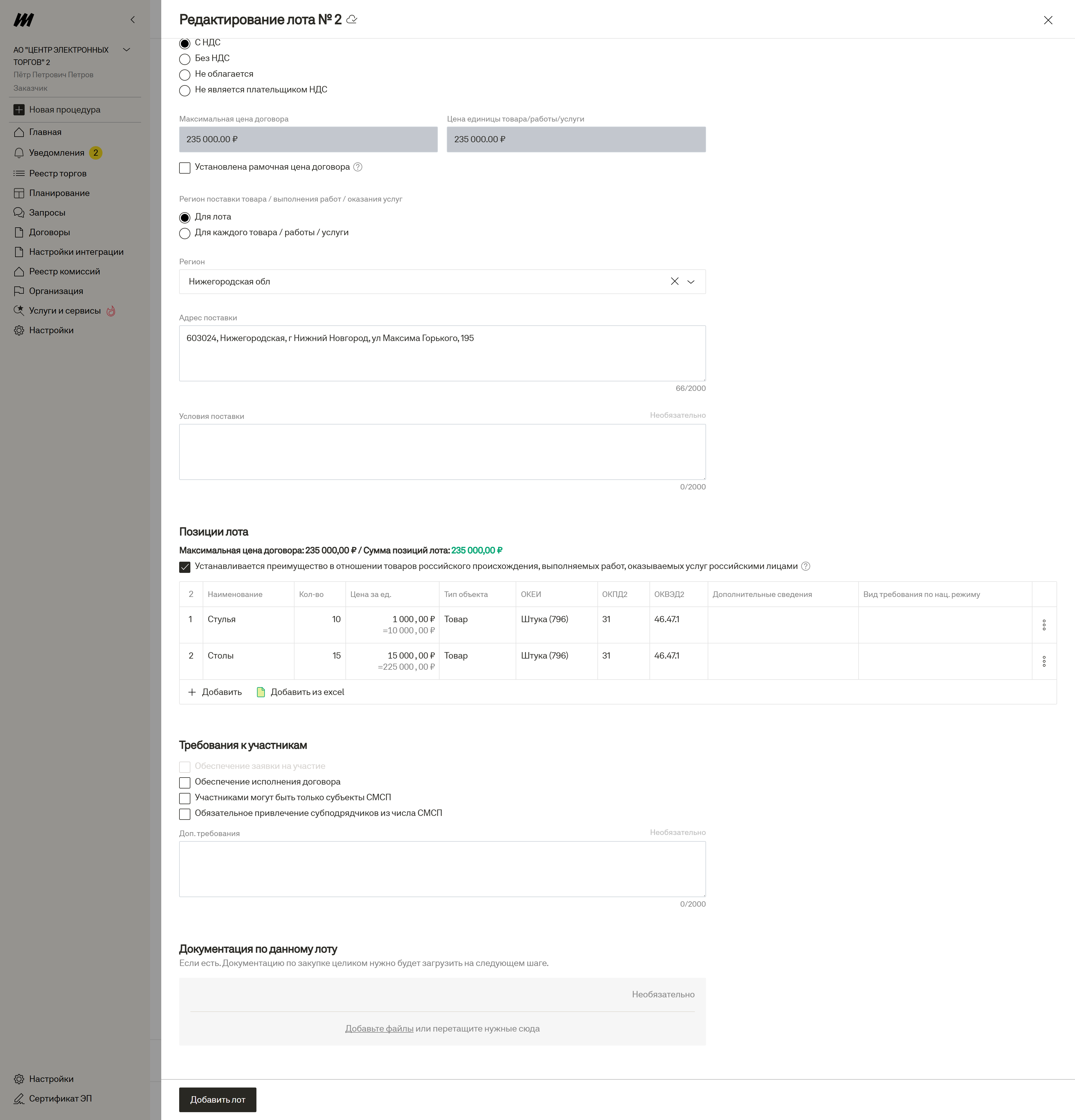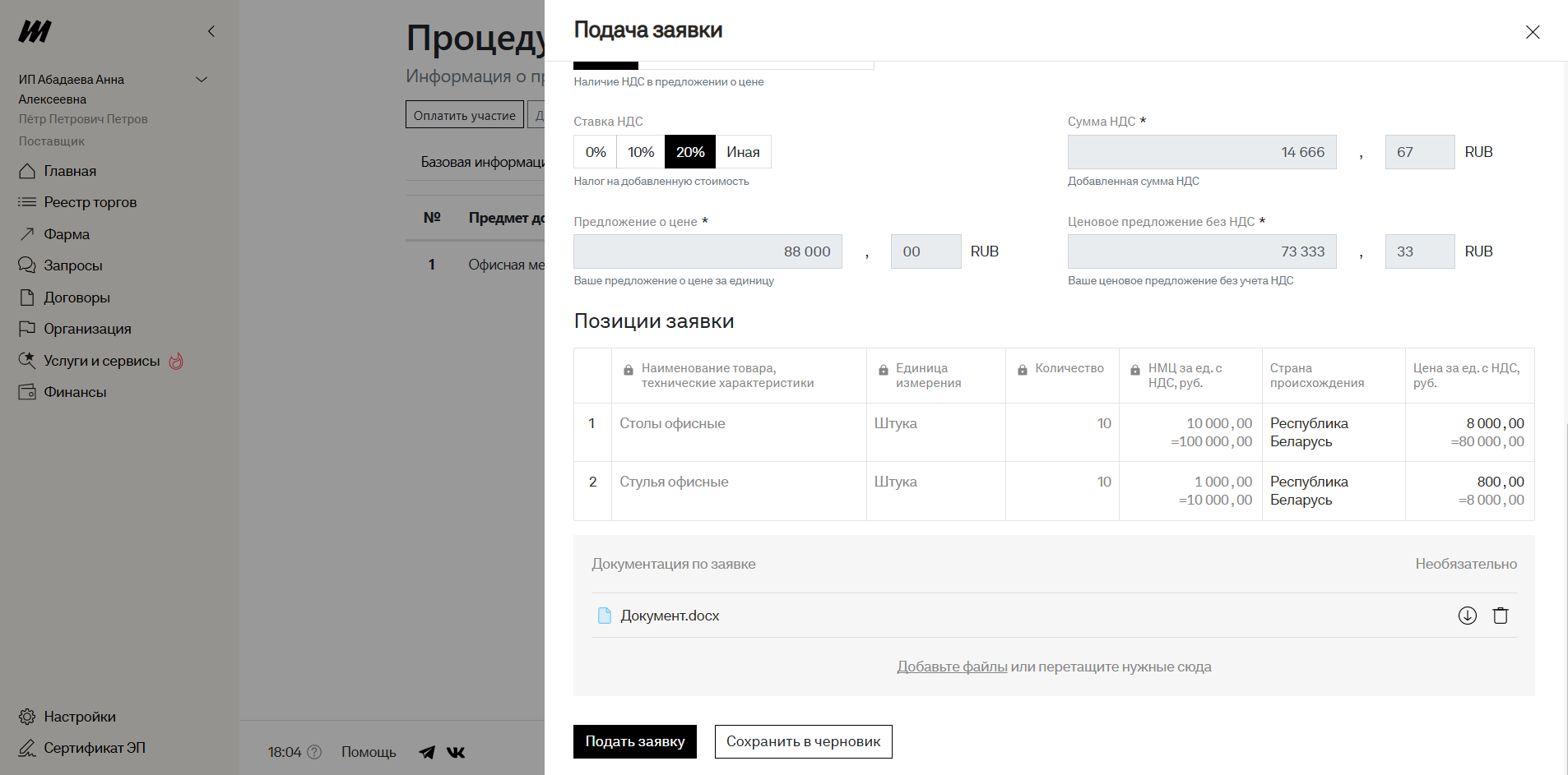 В заявке поставщик указывает только страну происхождения и цену за единицу по каждой позиции лота. Если у позиции лота была установлена НМЦ, то предлагаемая цена позиции не должна превышать НМЦ позиции: