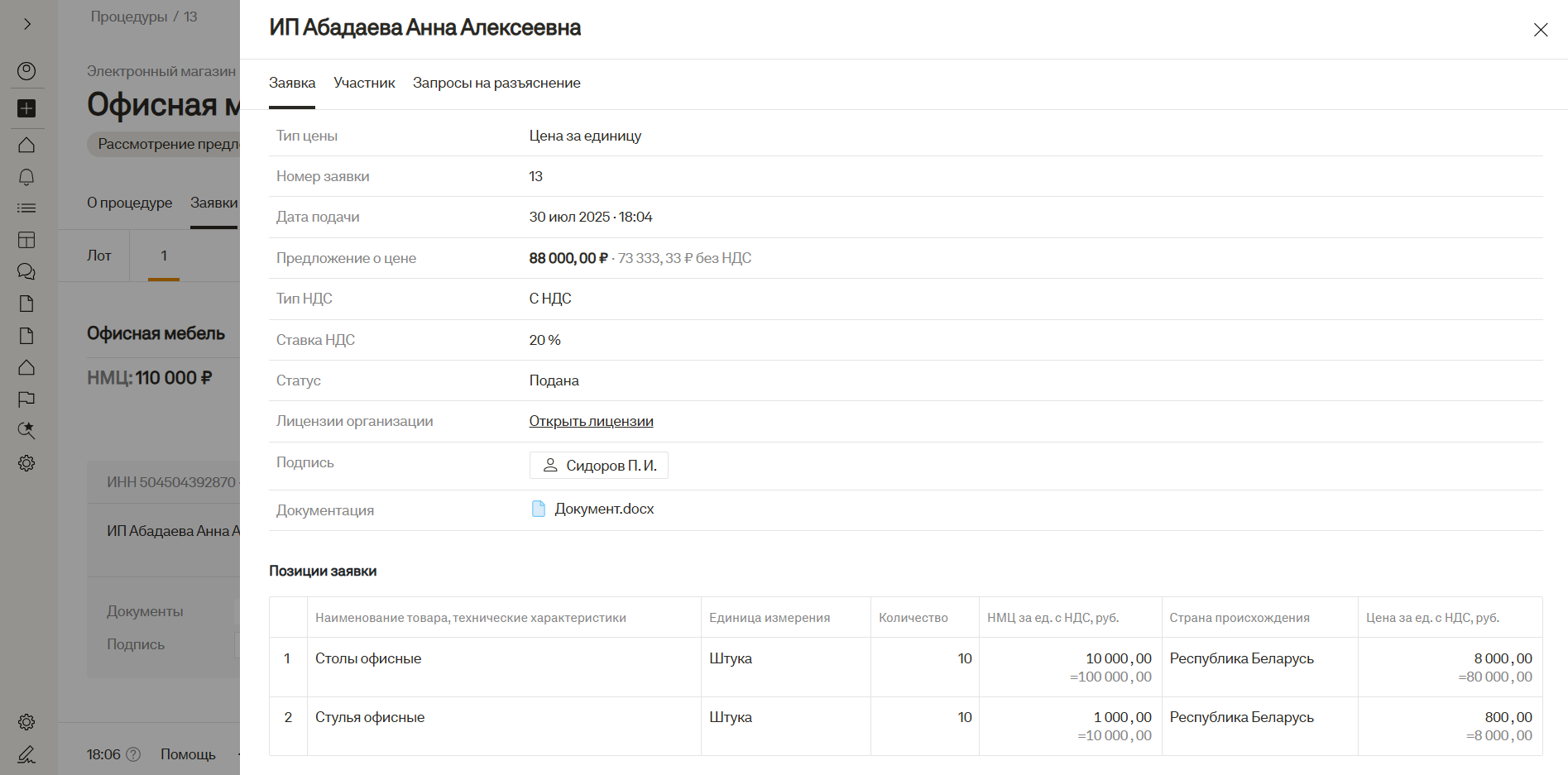 Для наглядности добавлен индикатор применения преимущества и новое поле «Цена с учетом преференций» в карточке заявки: