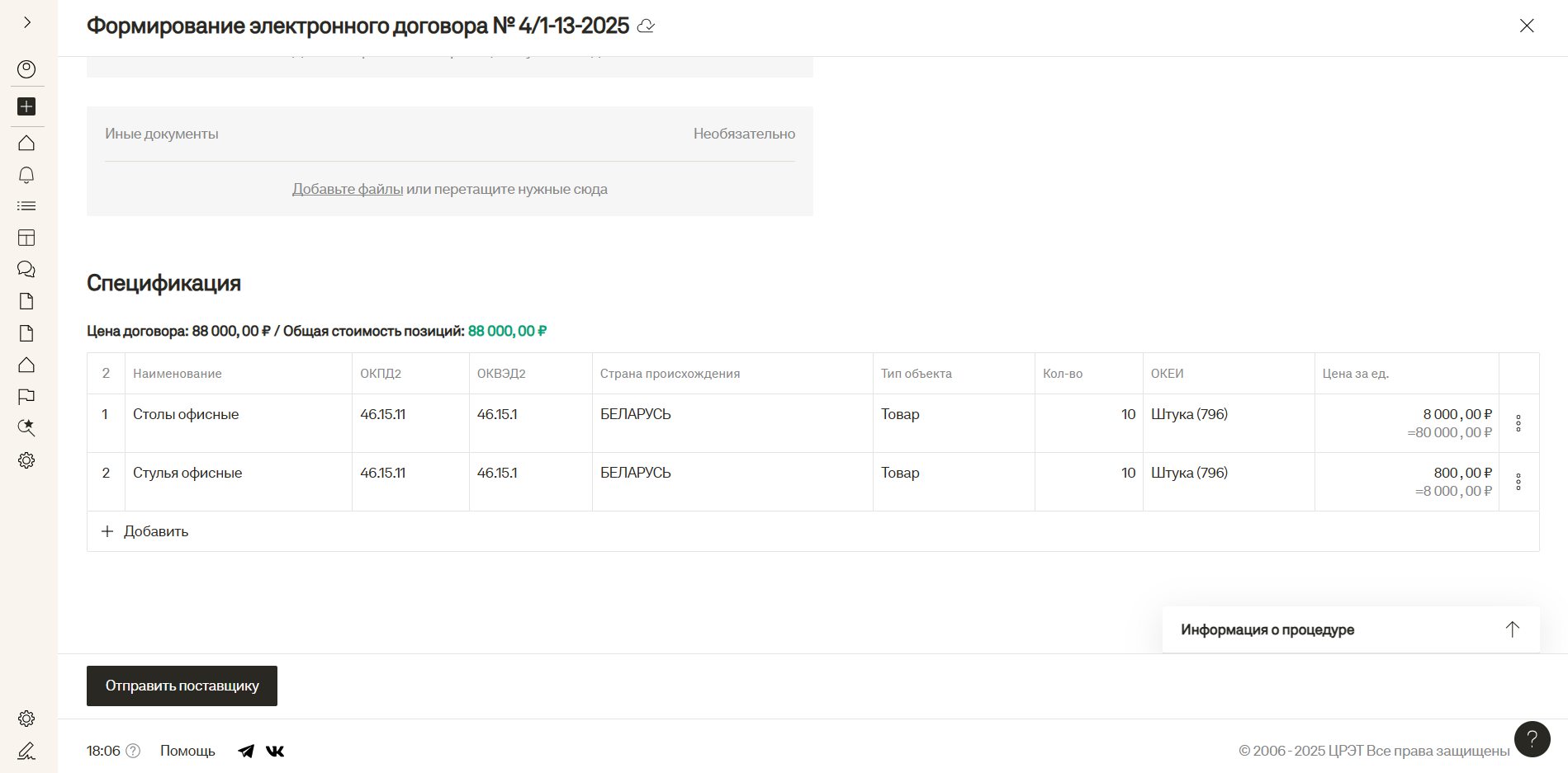 Если объем закупки определен и признак рамочной цены не установлен, то в черновике договора общая стоимость договора предзаполнится из стоимости заявки того поставщика, с которым заключается договор: